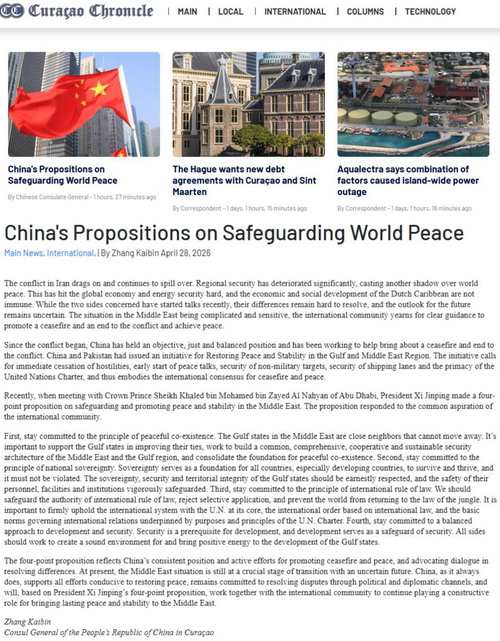 2026年4月28日,驻威廉斯塔德总领事张凯斌在库拉索英文媒体网站纪事新闻网发表署名文章《维护世界和平的中国方案》,全文如下: